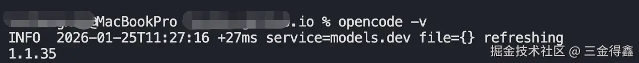 使用 opencode -v 来测试是否安装成功。