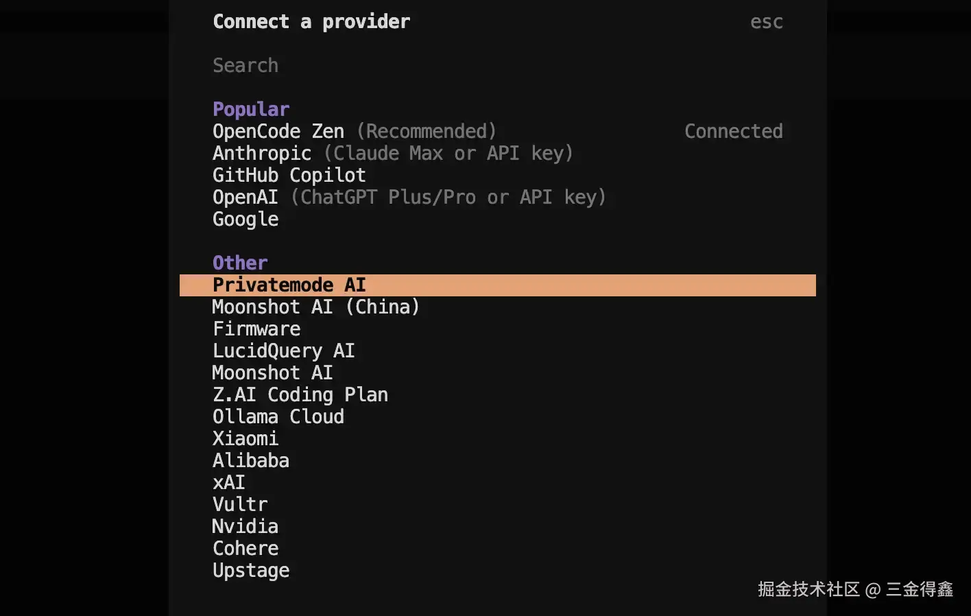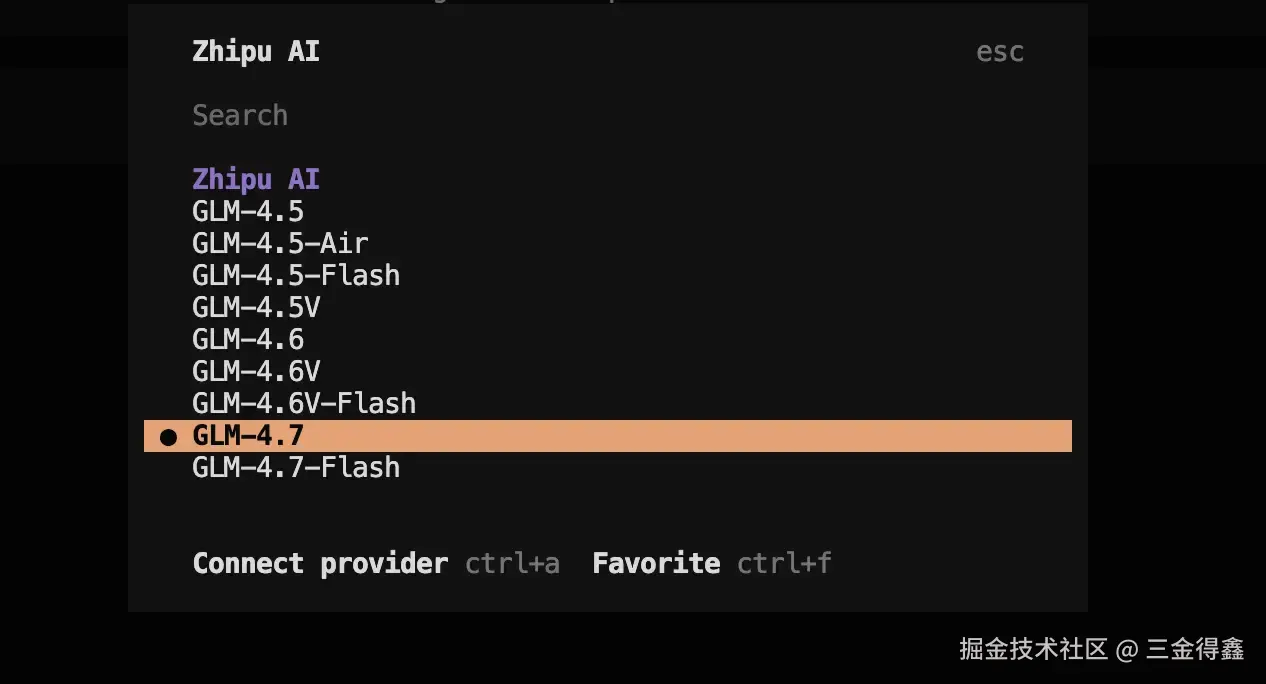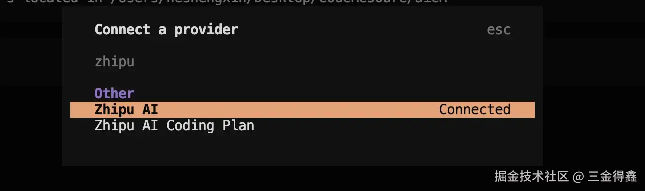 当然,我们也可以配置其他的 AI 模型,之前买了智谱的季卡,让我们一起通过 /connect 来配置一下: