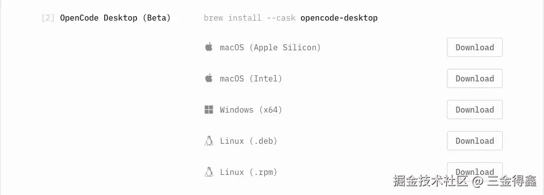 桌面客户端现在还处于 BETA 期,我们可以在 opencode.ai/download 页面进行下载: