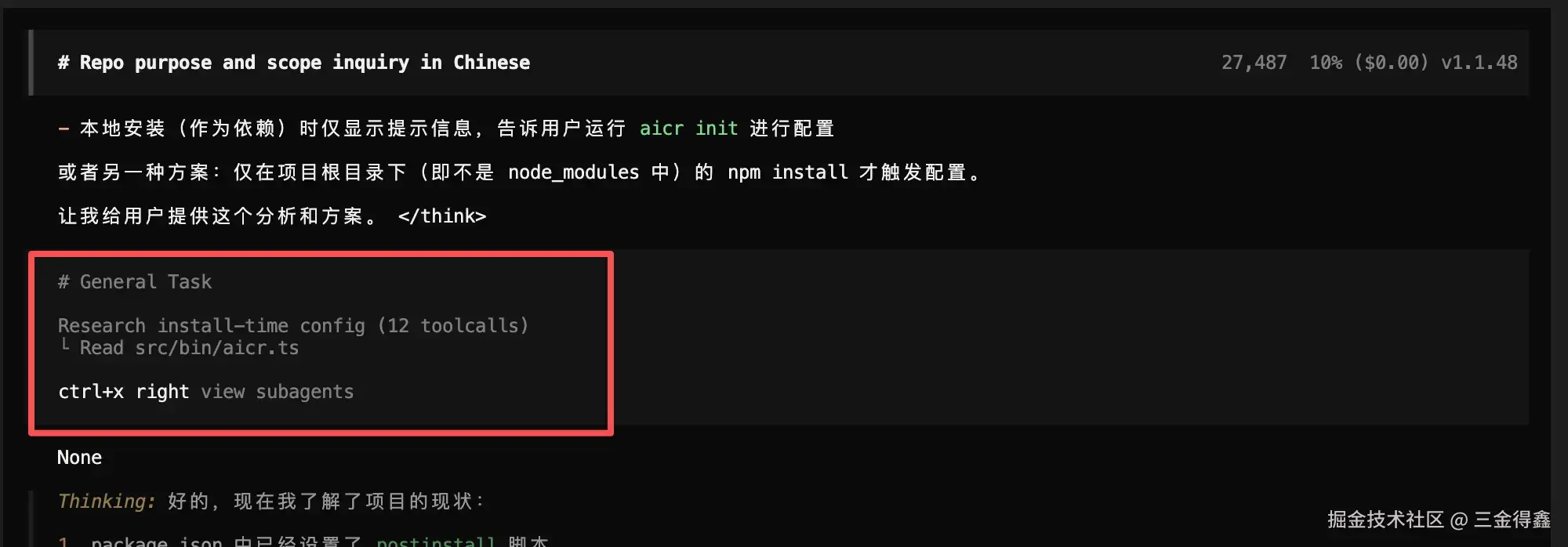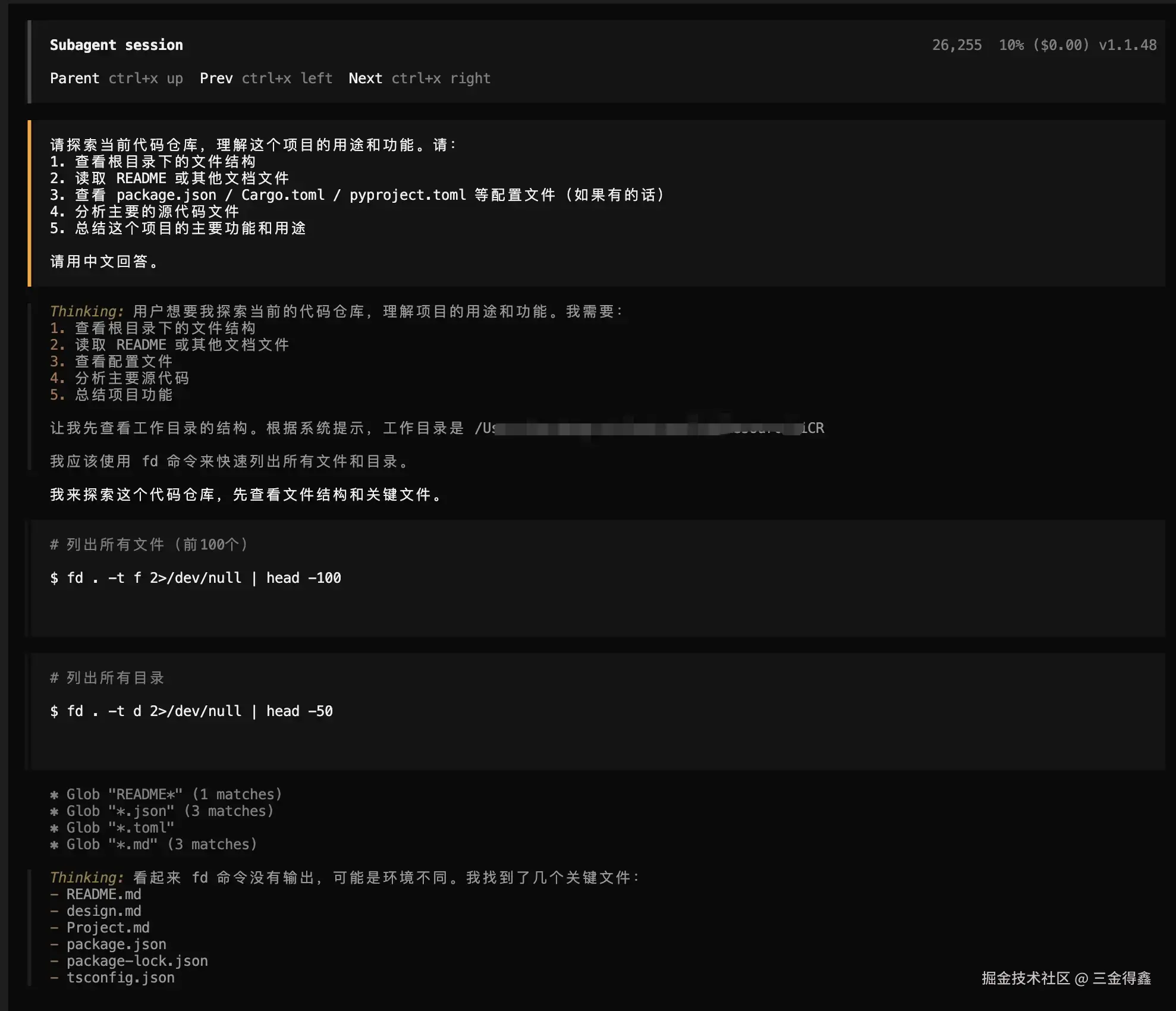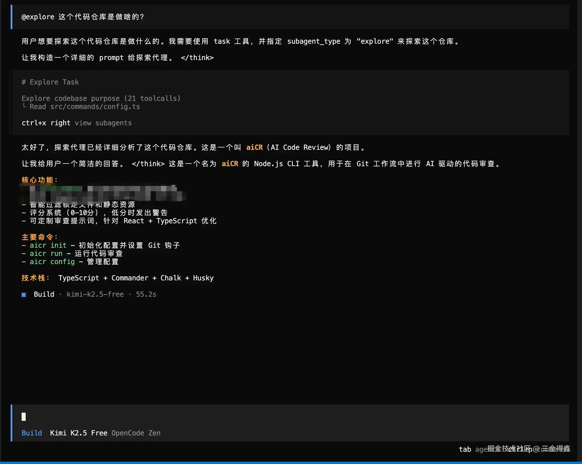 再通过点击上方的 ctrl+x up 回到主会话。需要注意的是,这个子会话的能力三金在 opencode 客户端并没找到,不知道是能力没对齐还是啥,我先提个 issue 先。