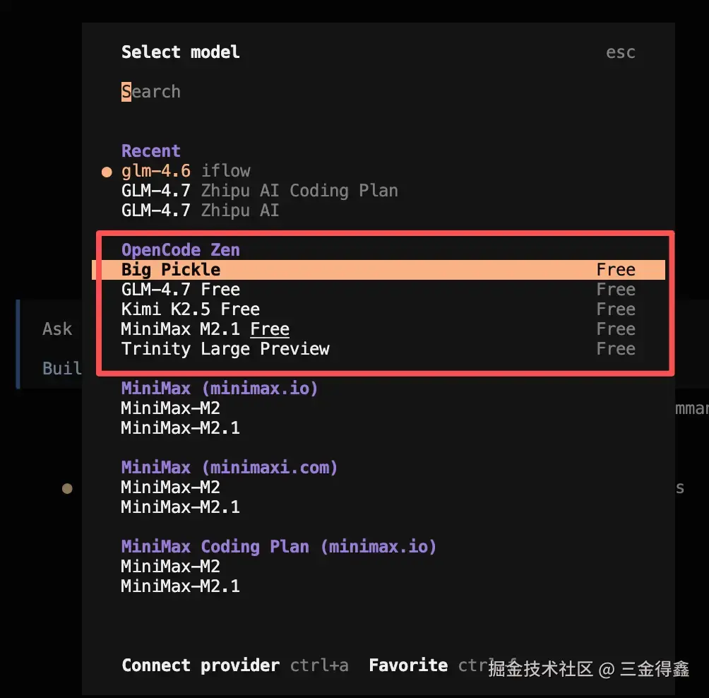在 OpenCode 中,支持 75+ 的 LLM 提供商,也支持本地模型,有时还会提供一些免费模型。在三金写这篇文章的时间,OpenCode 提供了以下几个免费模型: