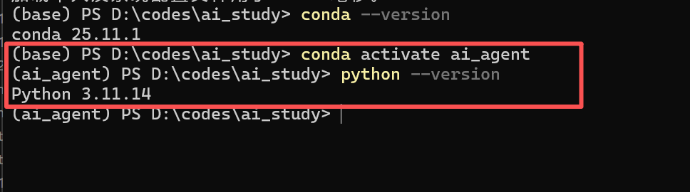 # 2. 激活环境(看到命令行前缀变成 (ai_agent) 即成功)