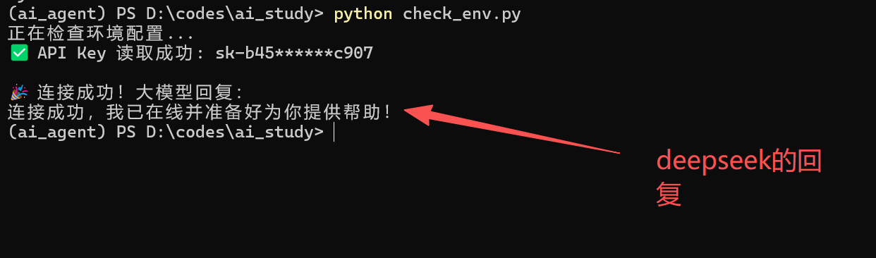 如果你看到 “🎉 连接成功!” 以及 DeepSeek 的回复,恭喜你!你已经拥有了一个可以随时调用的 AI 大脑,并且搭建好了专业的 Python 开发环境。