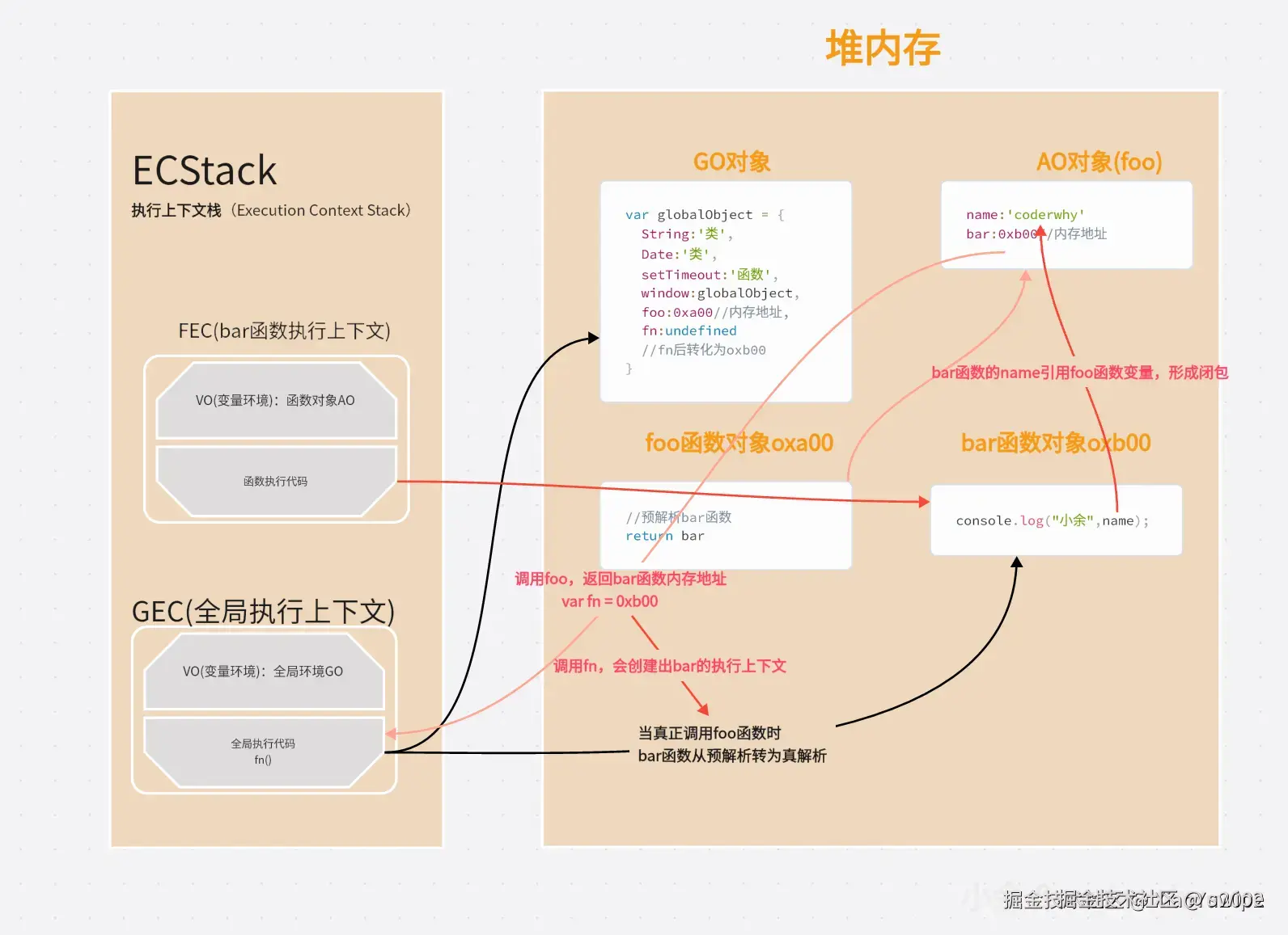 foo()调用时创建foo的执行上下文与 AO;bar函数对象存在于堆上,foo的 AO 里保存了它的引用;return bar让全局fn指向bar的函数对象地址;- 后续