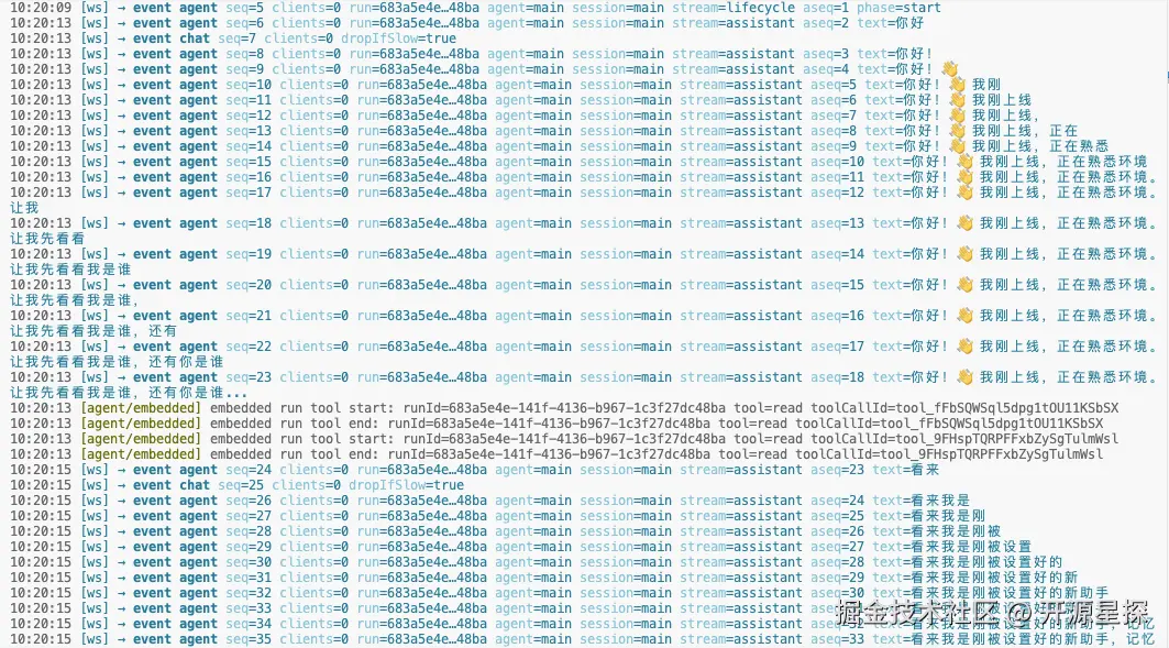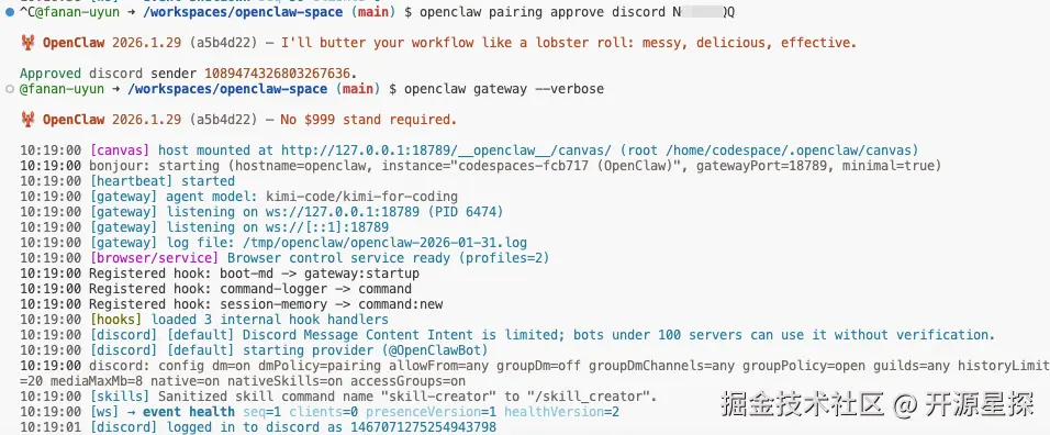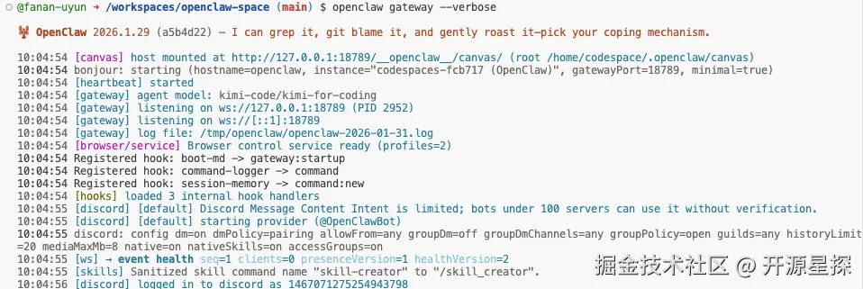 启动成功后,从启动日志中我们也可以看到主模型用的Kimi-Code的模型,channel应用连接的Discord。