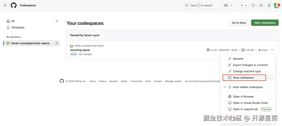 当然,你如果长时间不用了,可以在 CodeSpaces 页面将当前服务器给关机了也行。
