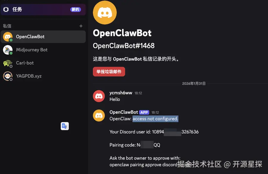 我们直接与Bot进行对话后拿到配对码(切记一定需要和OpenClawBot进行私聊!!)