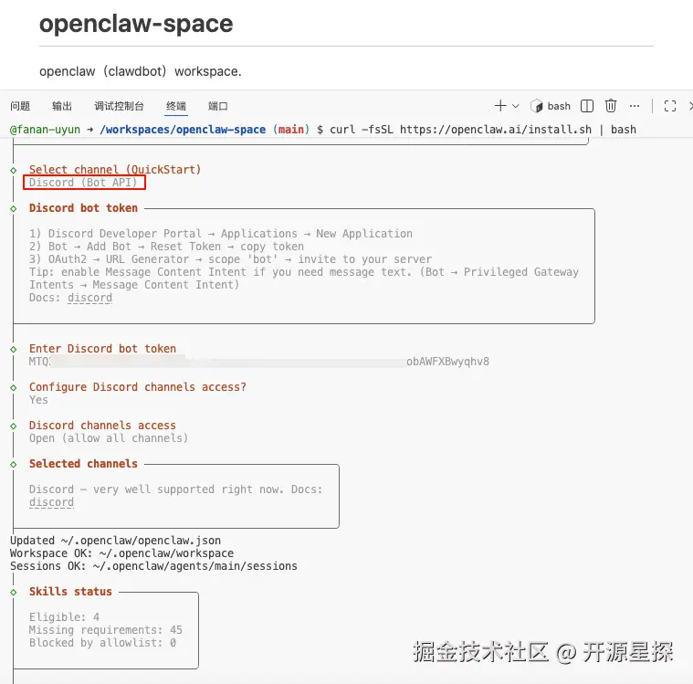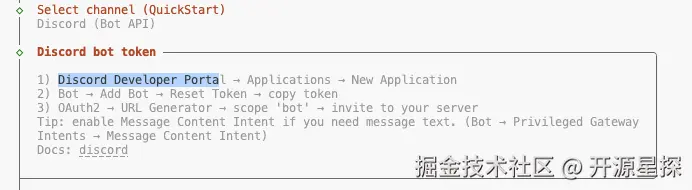 继续选择 Channel 应用,这里我们直接选择了 Discord,然后根据它的提示来继续往下走,可以看到它需要一个 Discord Bot Token 才能继续。