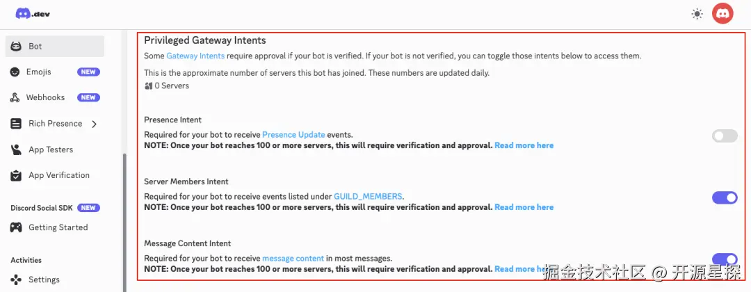 然后开启关键权限(必做,否则 openclaw 无法读取消息 / 发送回复),下滑到 Privileged Gateway Intents,开启MESSAGE CONTENT INTENT(读取消息内容)、SERVER MEMBERS INTENT(可选,用于服务器成员权限控制)。