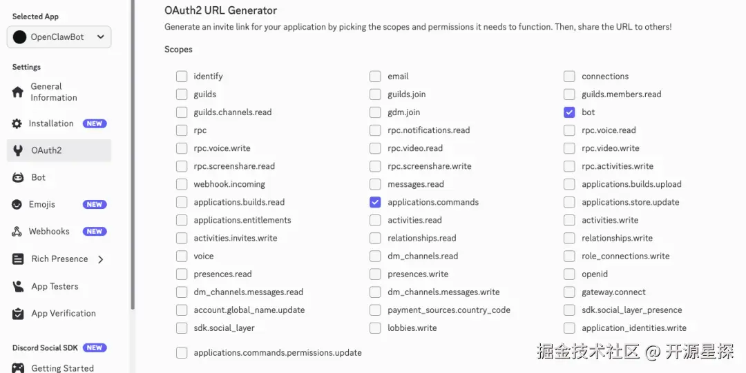 再点击左侧 **OAuth2 **→ OAuth2 URL Generator,勾选以下权限: