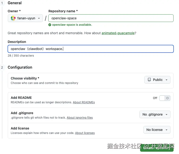 然后给新仓库起个名称,这个可以随便起,我这里起的是 openclaw-space,其他参数不用管,直接点击“Create repository”。