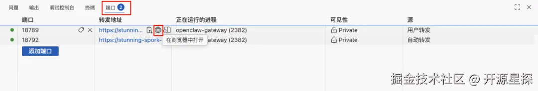 其实也非常地简单,GitHub 其实也为我们考虑到了,它会自动识别 OpenClaw 开启的服务,并帮我们把内网端口映射到公网(入口就在“终端”旁边的“端口”那栏)。