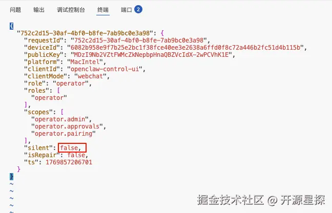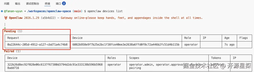 这是因为 OpenClaw 检测到有新设备(你的浏览器)接入,出于安全考虑,它需要你在后台同意。(这个在上一次发的「MoltBot 接入飞书」的文章中也有写过。)
