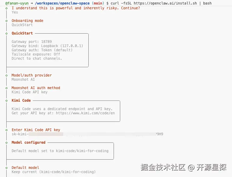 继续往下走,选择同意协议(Yes),模式选择快速开始(Quick Start),模型我们就直接选择月之暗面(Moonshot AI)的模型,然后再选择Kimi Code(K2.5)的API,复制粘贴刚刚创建的 API Key。