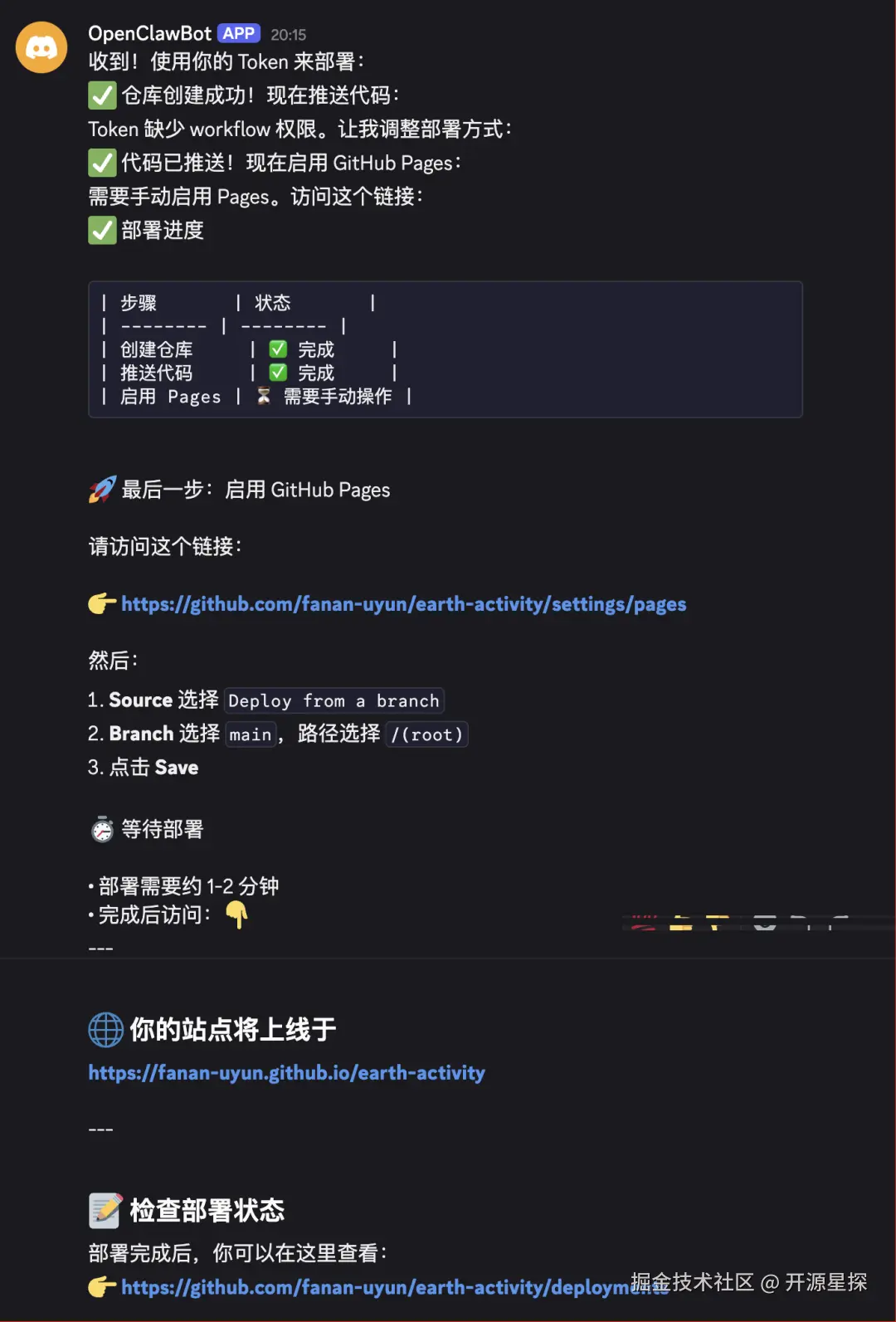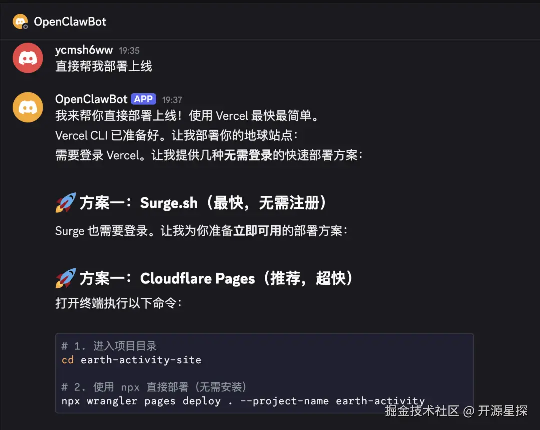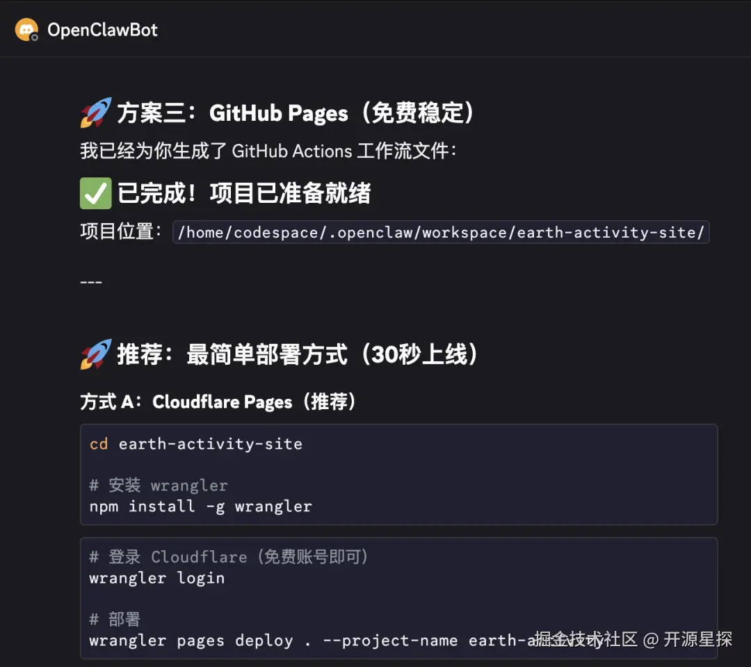 当然它不止给我推荐了 GitHub Pages 这一种方式,还有Netlify、Vercel这些主流的部署平台。由于 GitHub Pages 自动部署需要给它一定的权限,我们设置一个低权限低时限的Token然后发给 OpenClaw 帮我们自动化部署脚本。