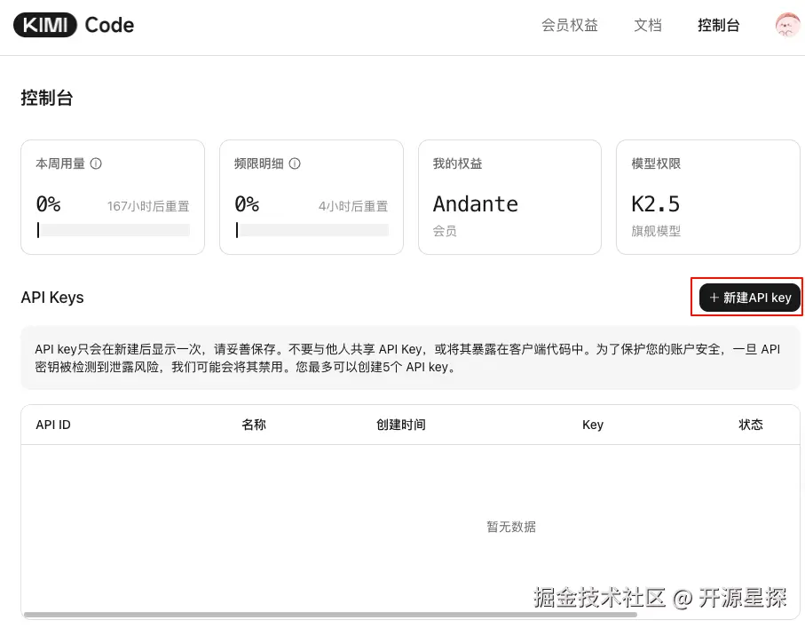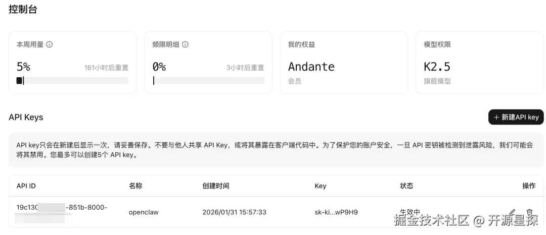 订阅后就是 K2.5 模型,然后我们创建一个 API-Key 并保存起来。