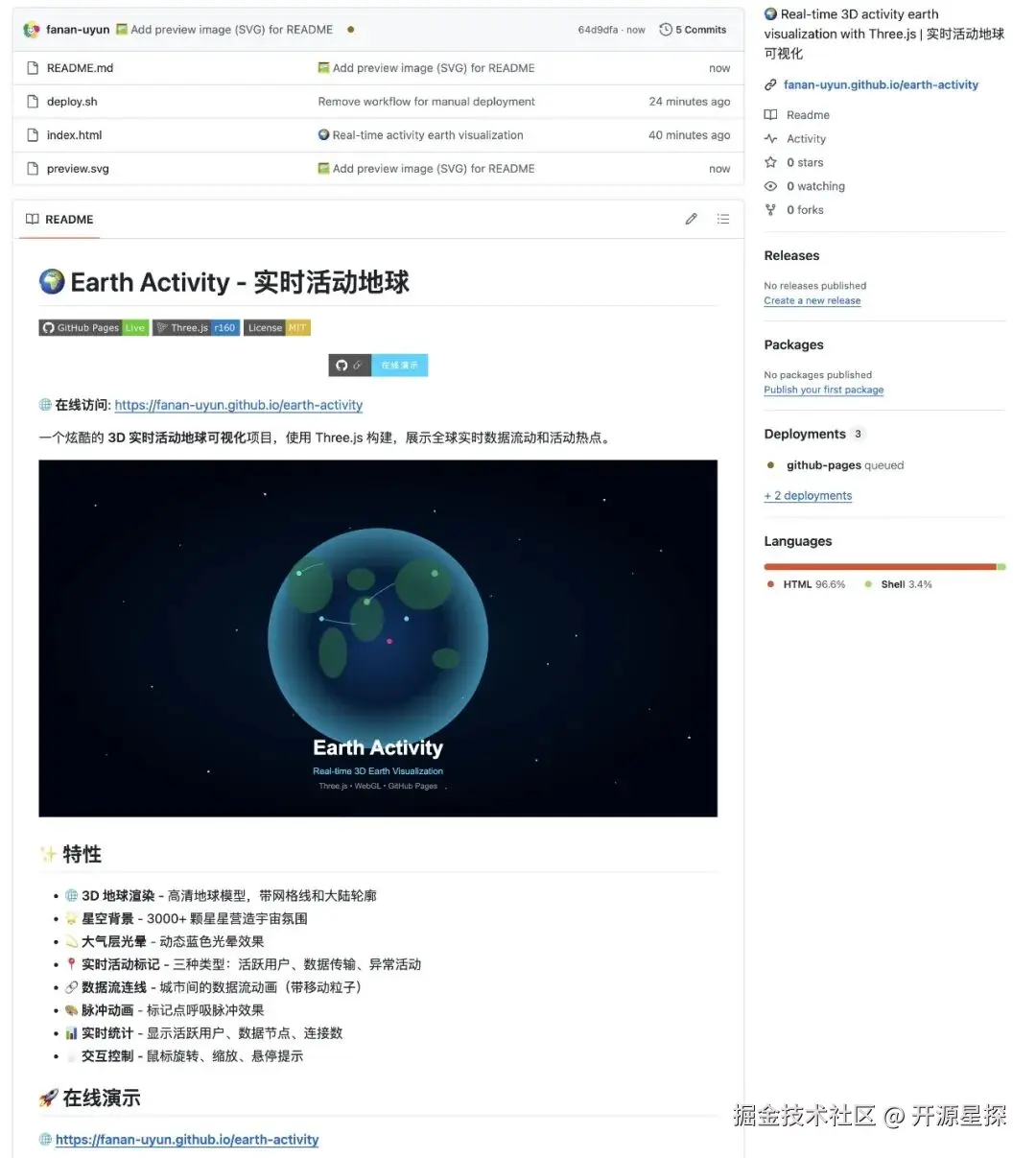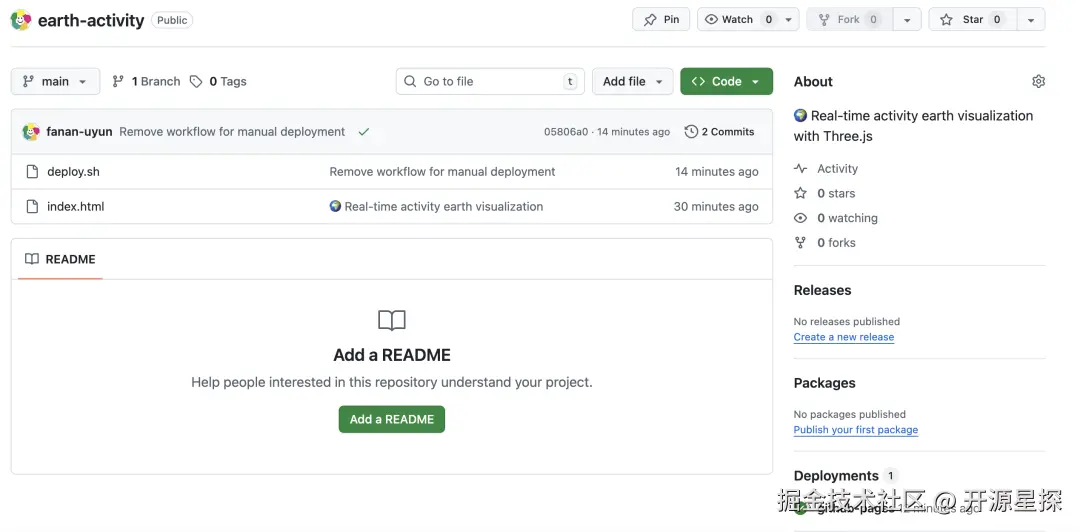 效果还是非常不错的,很酷很美观。然后我们回到这个自动创建的仓库代码页面,里面也有最新的部署(Deployment)状态显示。