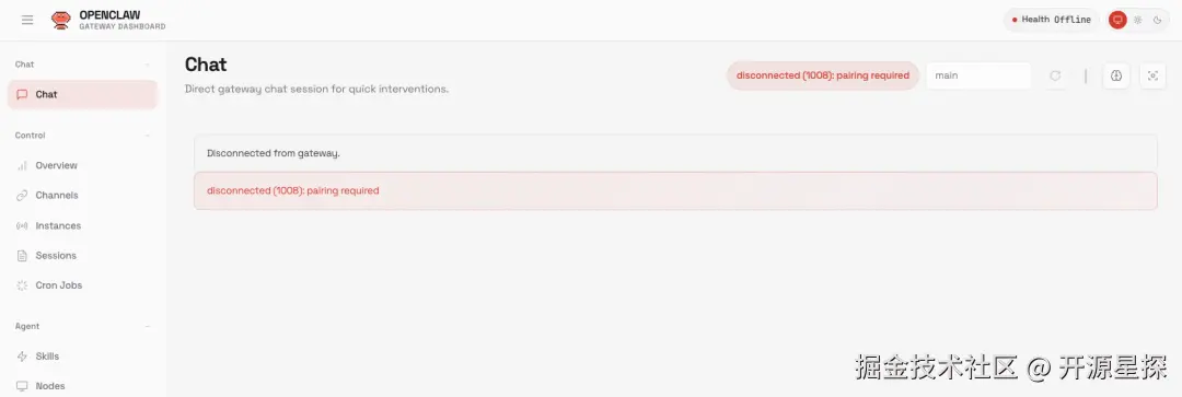 然后就会出现新的 1008 报错:disconnected (1008): pairing required。