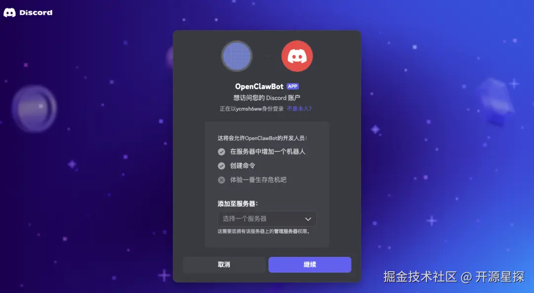 点击继续后进行授权,即可邀请bot(OpenClawBot)加入: