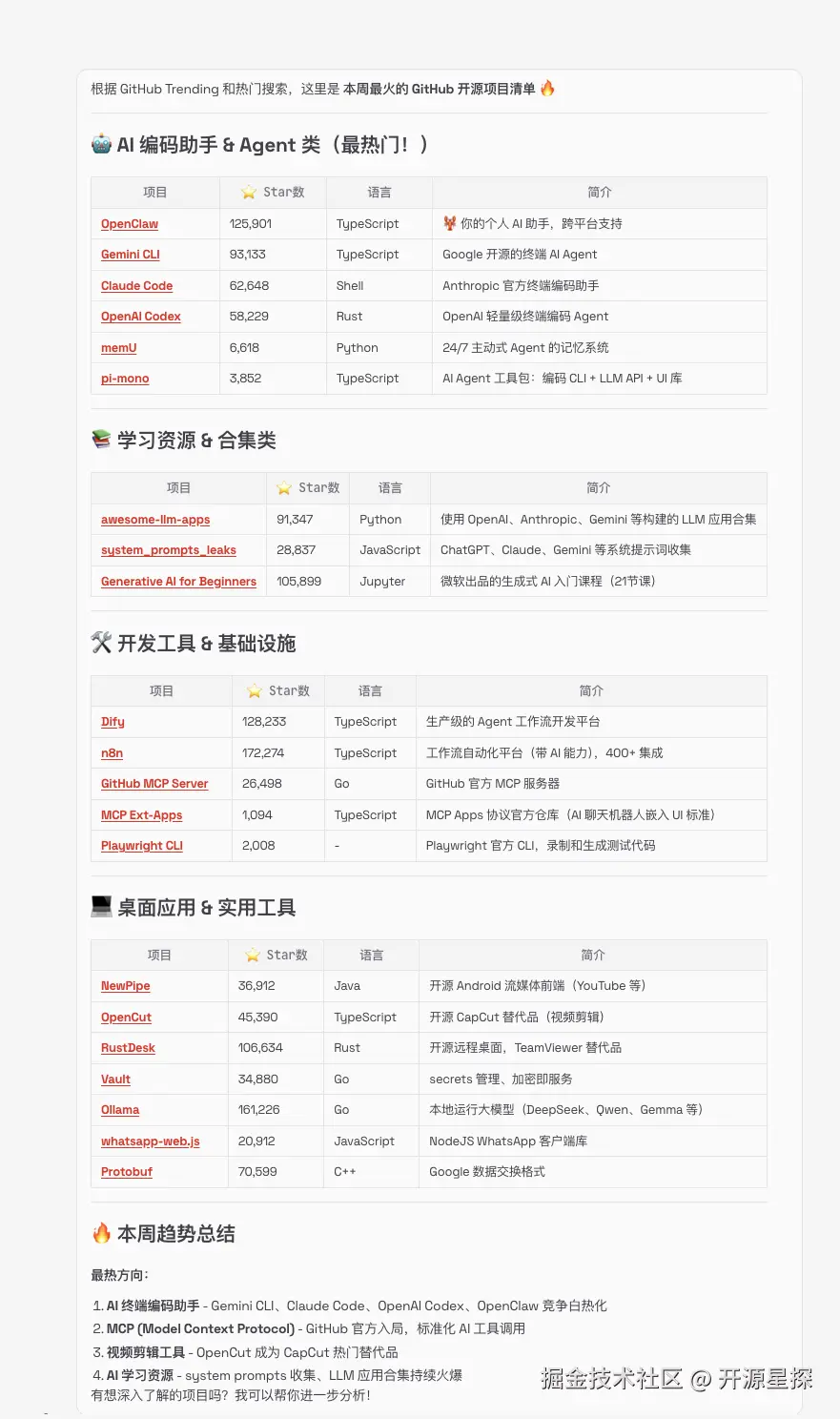 比如:最近有哪些 GitHub 开源项目很火?整理一个本周最火的开源项目清单给我。