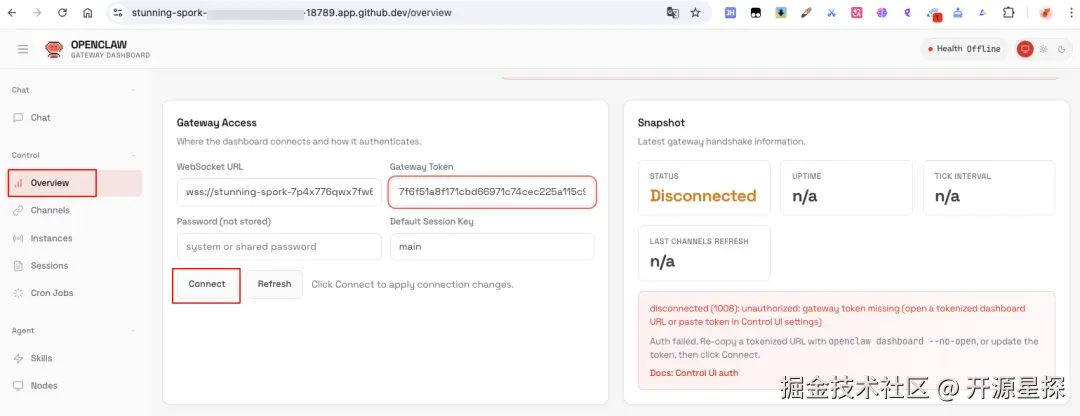 还记得之前在配置向导结束时,让大家记录的地址+Token嘛,就是那个Token,然后把它填入 Overview -> Gateway Token,然后点击 Connect。