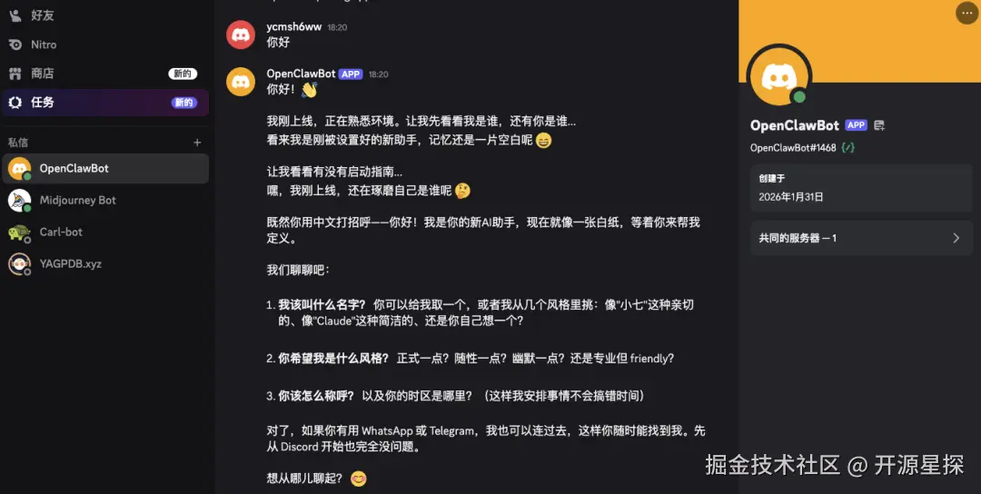 最后回到Discord与Bot进行对话,如果正常回复则说明部署成功。