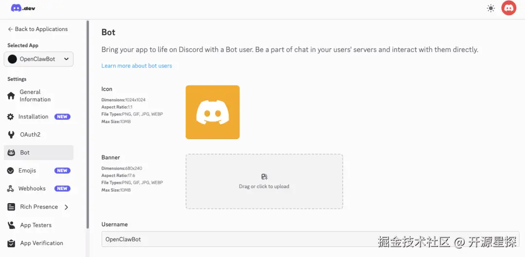 完成后,打开 Discord 开发者平台,点击 New Application,输入 Bot 名称,同意条款后点击创建。