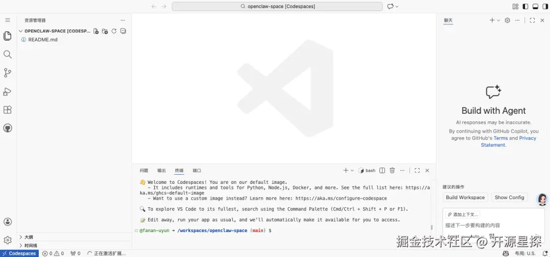 等待新页面刷新完成,你会看到一个类似 VS Code 的Web页面,到这里就说明Codespace云端主机已经开机了。