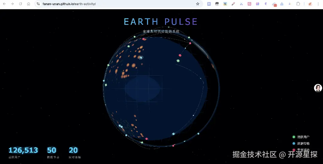 比如:用Three.js帮我开发一个实时活动地球效果的站点。