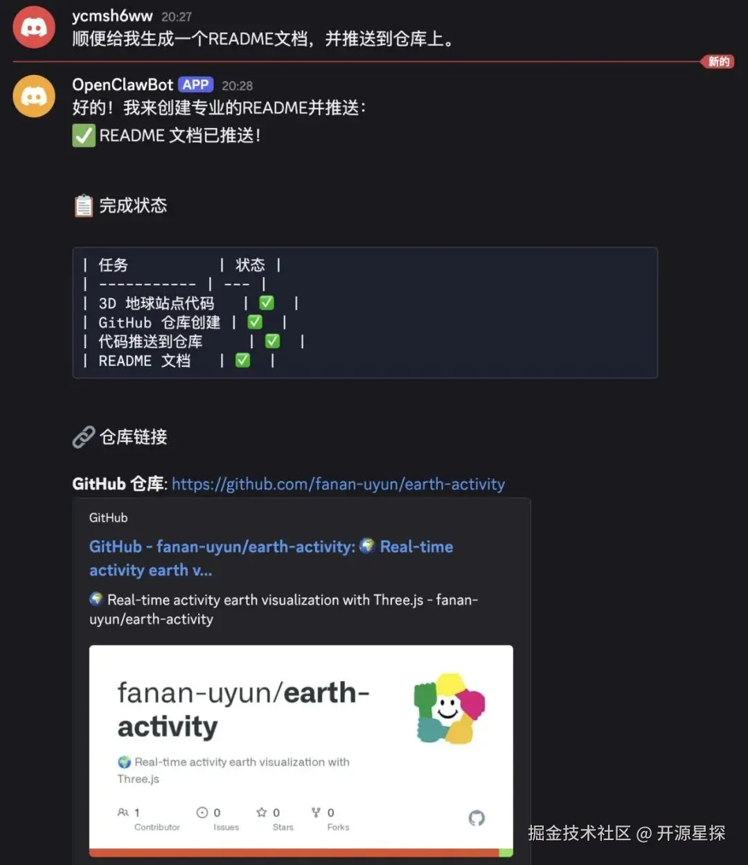 不过好像这个项目差点什么东西,就是映入眼帘的Readme.md文档。我们继续让 OpenClaw 帮我们自动生成并推送到仓库。