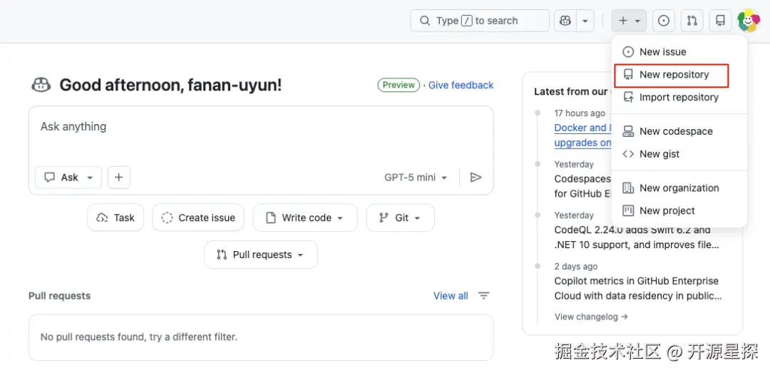 我们需要在 GitHub 上新建一个项目仓库。打开 GitHub 主页,点击右上角“+”号,选择“New repository”。