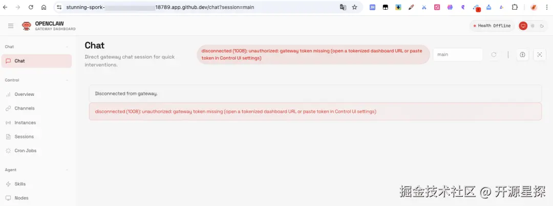 既然 Discord 已经成功连接上了,我们之前在本地部署是通过http://localhost:18789/?token=xxx来访问Web控制台,那么现在如何通过 GitHub 来访问 OpenClaw 的Web控制台呢?