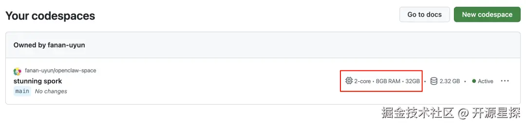 **GitHub Codespaces **就相当于一个 GitHub 的云端环境,每个账号都会有,而且配置还不低,因为我们之前用轻量云服务或VPS大都选择2核2G内存的,而 **Codespaces **直接送你2核8G内存、32G硬盘的云服务器。