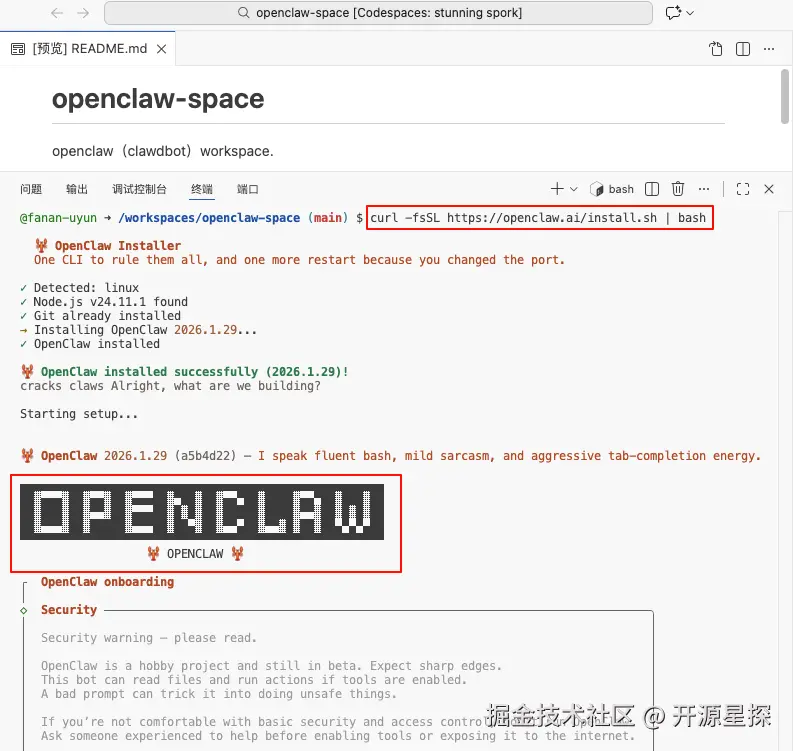 把 Codespaces 就当成 VScode IDE,打开下方终端,直接粘贴官方的一键安装命令。