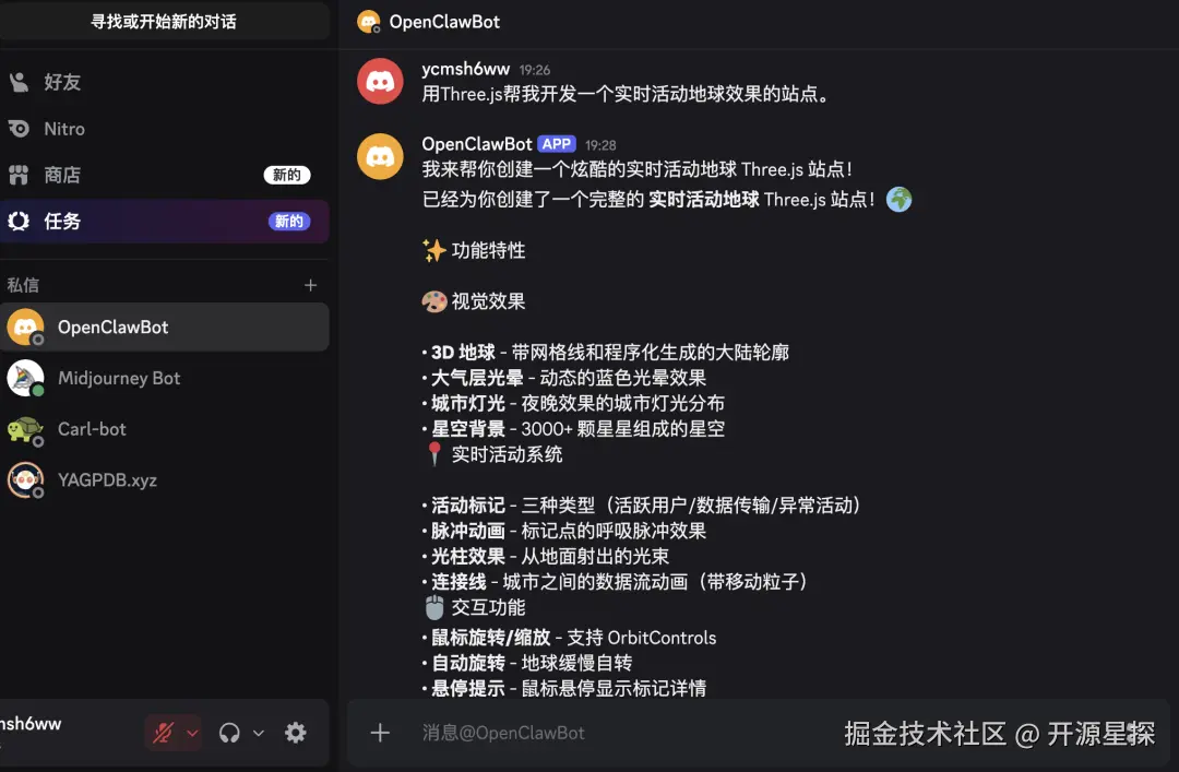 一切就绪,我们可以通过 Discord(这个不光只有网页和电脑客户端,也是有手机端APP的) 来完成 7x24 小时的随时下发写邮件、梳理工作日报、自动开发脚本等任务。当然也可以进行定时任务。
