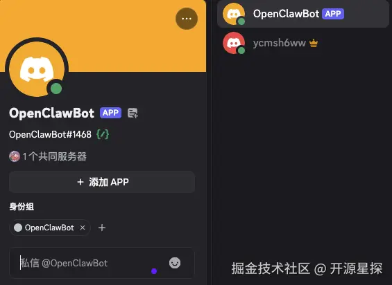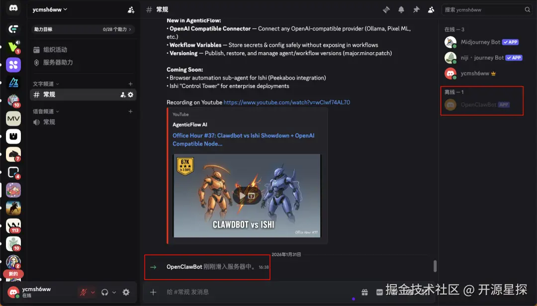 打开我们自己的Discord服务器主对话框内,你就发现刚刚添加的 OpenClawBot 已经显示了,不过是离线状态。