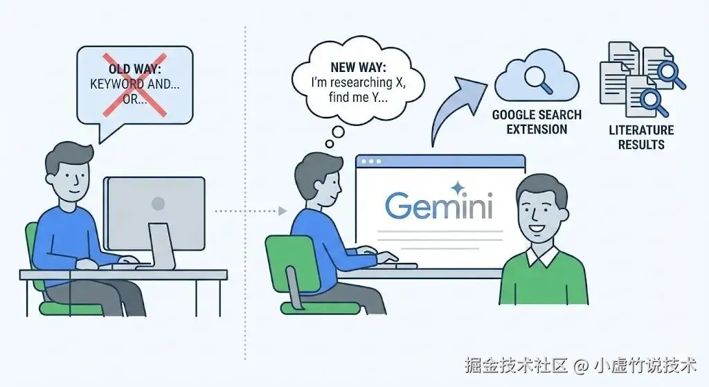 只要你开启了 Gemini 的联网功能(Google 搜索扩展),就能像和导师交流一样,直接阐述研究背景、问题和你想要的结果。