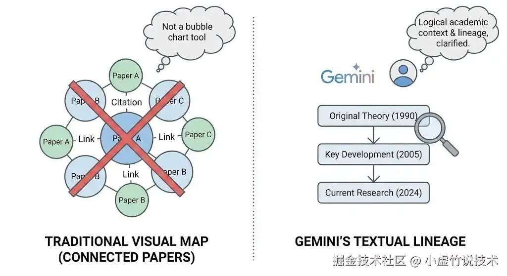 Gemini 虽然做不到像 Connected Papers 那样,直接甩你一张炫酷的引用“泡泡图”,