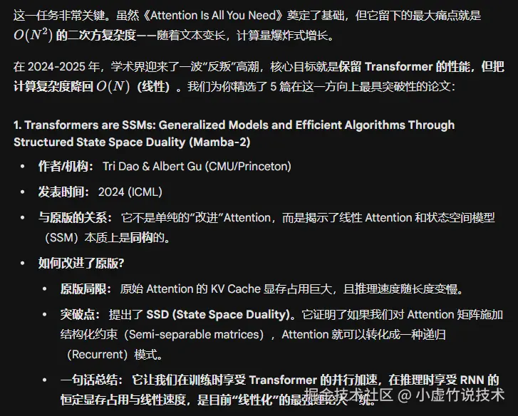 追踪 Prompt(可直接复制填空):“以 [填入经典论文标题,例如:Google 的《Attention Is All You Need》]为核心,请帮我找出 [填入年份范围,如 2024-2025]年引用了这篇文章,并且在 [填入具体细分方向,例如:‘计算效率优化’或‘线性 Attention’]方面做出了最重要突破的 5 篇论文。 请重点告诉我:这些新论文具体是如何改进原版方法的?它们解决了原论文的哪些局限性?”