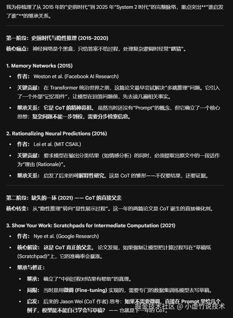 溯源 Prompt(可直接复制填空):“关于 [填入核心概念,例如:思维链 (Chain-of-Thought)] 这一概念,在这个术语正式大火之前,有哪些具有奠基意义的早期论文? 请利用网络搜索,帮我梳理一条从 [起始年份,如 2015] 到 [截止年份,如 2022] 的技术演进脉络。请详细说明每一篇关键论文是如何启发后者的,它们之间存在怎样的继承或修正关系。”