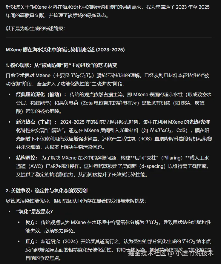 1. **检索:** 请用**英文**在 Google Scholar 和学术网络上,深度搜索关于 **[填入具体课题,例如:MXene 材料在海水淡化中的膜污染机制]** 的最新高质量文献,时间范围限定在 **[填入年份,如:2023年至今]**。