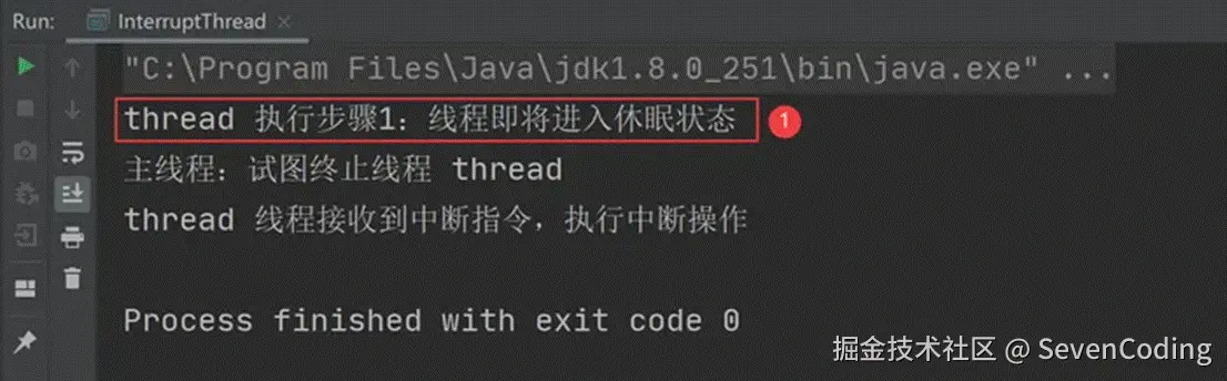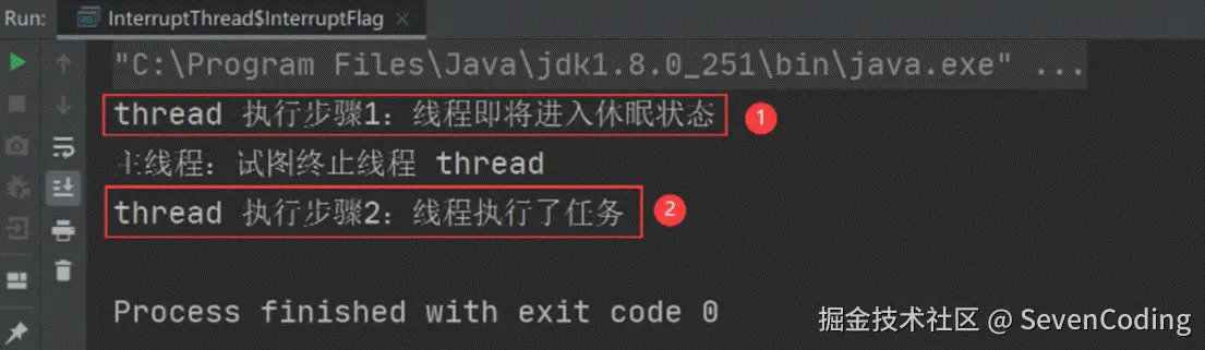 输出:我们期望的是:线程执行了步骤 1 之后,收到中断线程的指令,然后就不要再执行步骤 2 了,但从上述执行结果可以看出,使用自定义中断标识符是没办法实现我们预期的结果的,这就是自定义中断标识符,响应不够及时的问题。