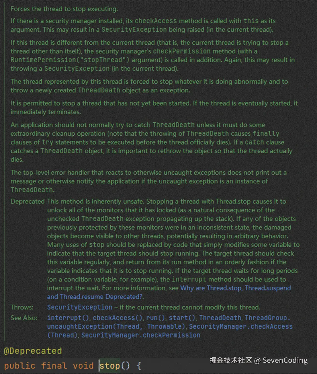 stop 方法虽然可以停止线程,但它已经是不建议使用的废弃方法了,这一点可以通过 Thread 类中的源码发现,stop 源码如下: