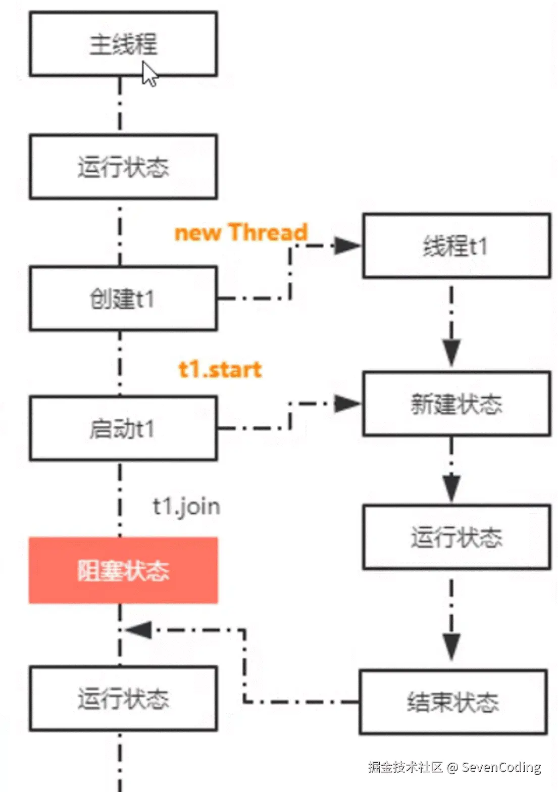 如果线程因为执行join(),sleep或者wait()而进入阻塞状态,此时想要停止它,可以调用interrupt(),程序会抛出interruptedException异常。可以利用这个异常终止线程