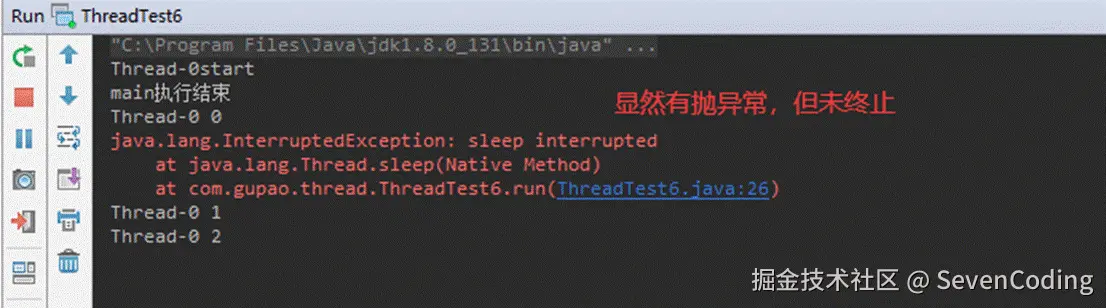 从上述结果可以看出,线程在接收到中断指令之后,立即中断了线程,相比于上一种自定义中断标识符的方法来说,它能更及时的响应中断线程指令。