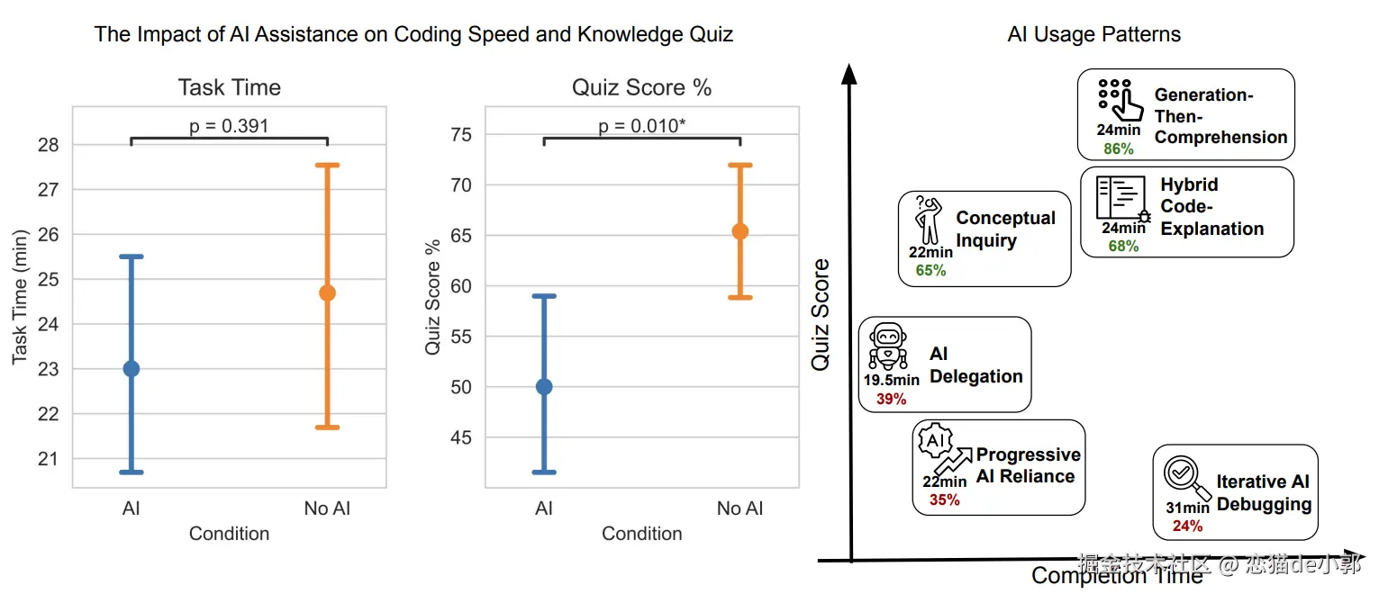 - 速度提升不明显:AI 组平均快大约 2 分钟,但没达到统计显著,对此作者也解释:这类任务是“学习新库 + 非重复性”,AI 的生产力优势不一定能充分体现,AI 更可能在“熟悉/重复性任务”上显著提速。