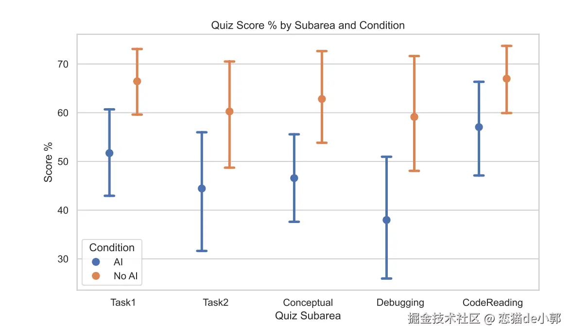 差距相当于“接近两个等级”(例如从 B 跌到 D 的差距),并且统计上显著(文中给了 Cohen’s d=0.738, p=0.01,最明显的差距出现在 Debugging 题:也就是“知道哪里不对、为什么不对”,这对“AI 时代的工程师”反而是更关键的能力。