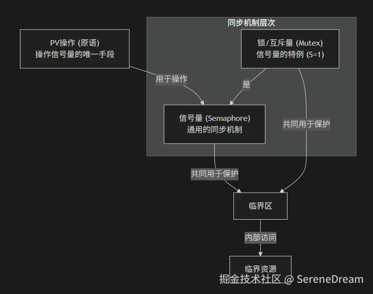 信号量是锁的超集,而PV操作是操作信号量的原语。锁(互斥锁)是信号量的一种特殊用法(初始值为1的信号量)。它们共同的目标是为了保护临界区,从而实现安全地访问临界资源。PV 操作的作用就是为了完成同步和互斥这两个功能