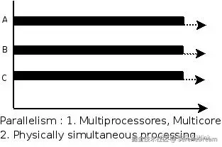 - 并行:发生在多个处理机上的多个进程,在一个时间段内,多个处理器或者多核处理器上同时处理多个任务。