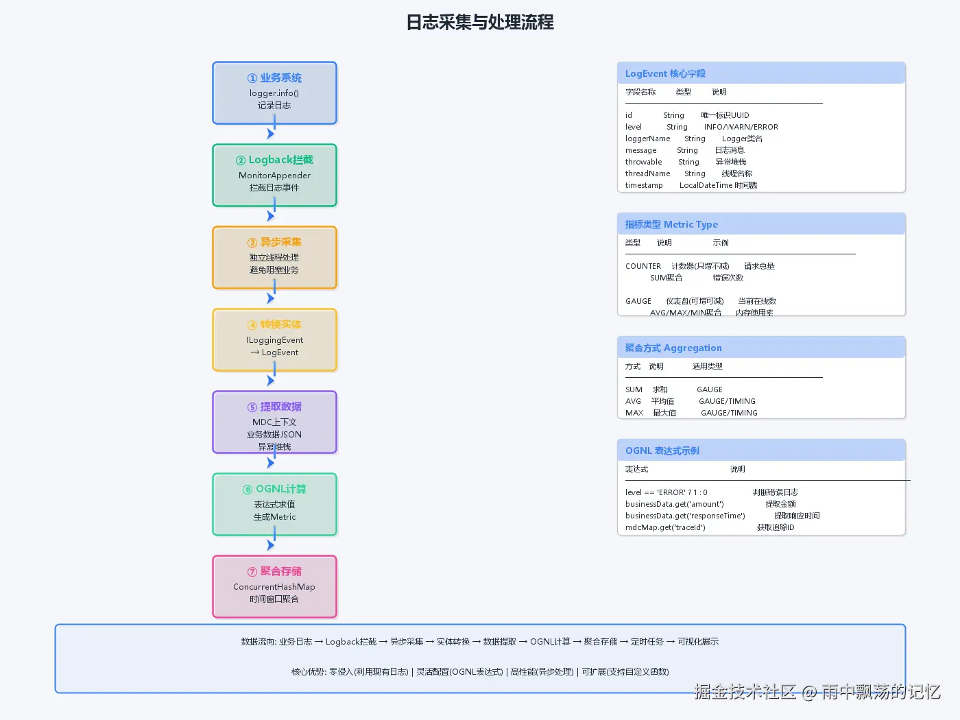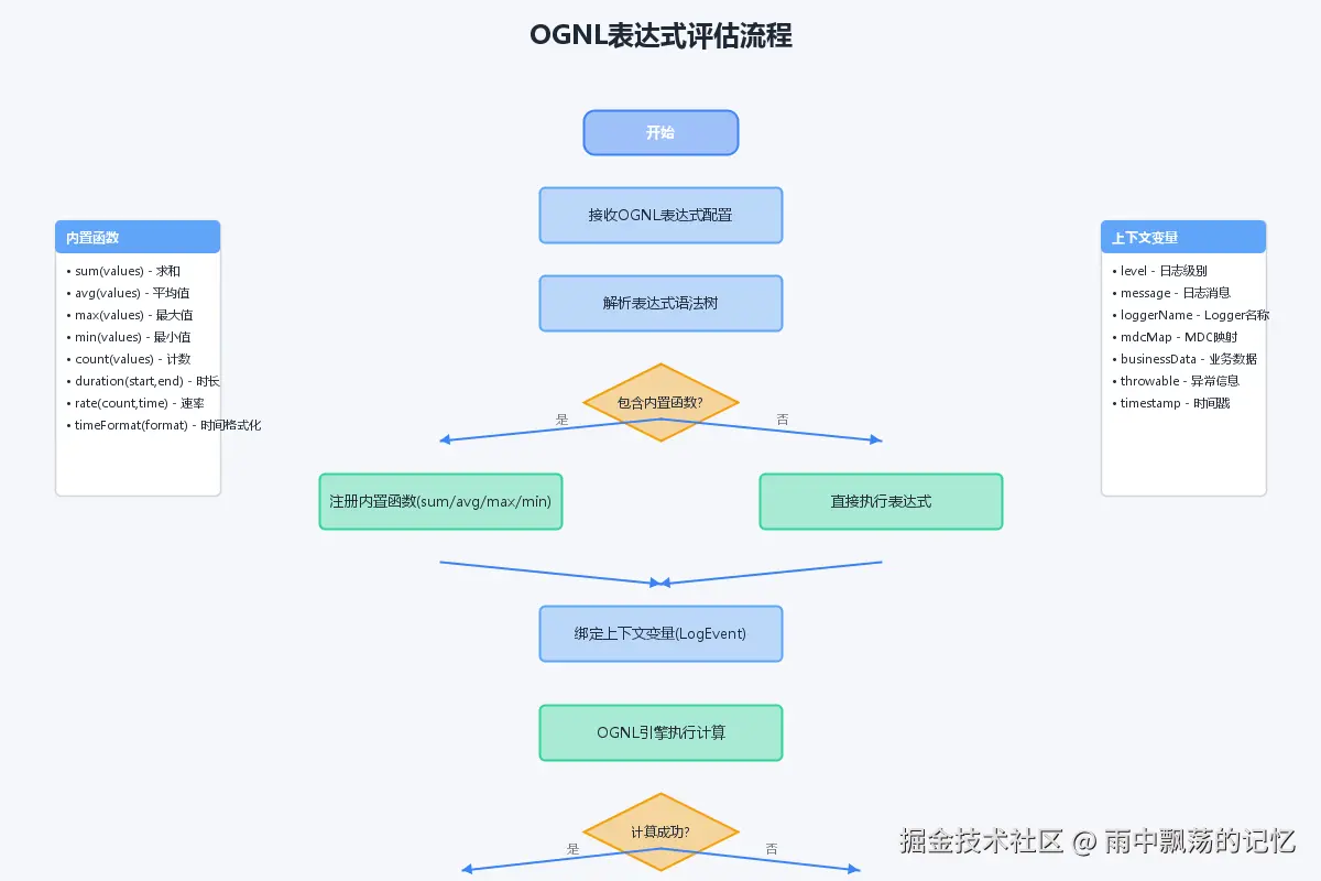 处理层:使用OGNL表达式引擎解析日志内容,提取业务指标并进行聚合计算。